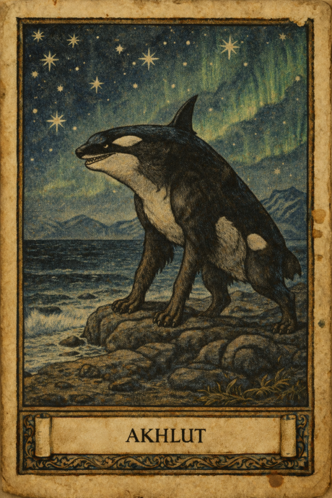 Akhlut is the land-sea hunter that dominates both worlds. It moves as an orca in the water and a wolf on shore. Stories linger on instances when wolf tracks run to the surf. The trail ends at the tide and continues as something unseen beyond the break.