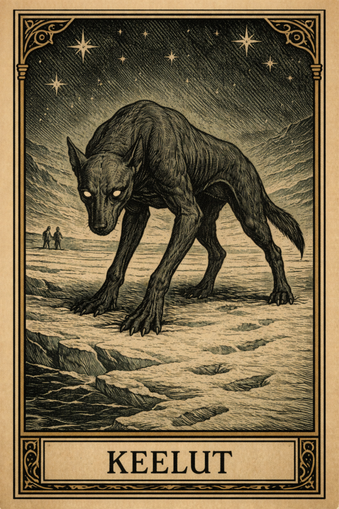 Keelut appears as a massive, hairless dog-like spirit. Witnesses describe a presence that feels wrong before it shows itself. Inuit traditions often place it near stories of the qiqirn. Accounts overlap in themes of fear, illness, and uncanny encounters. Some versions describe strange tracks that fail to read correctly in snow. The prints seem to cheat the rules of tracking.