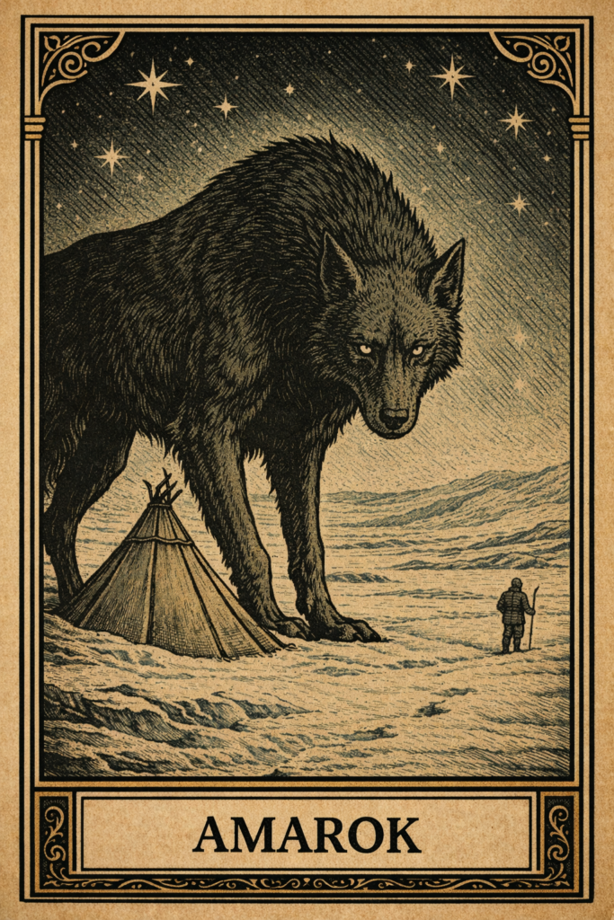Amarok stands as the lone wolf made mythic in Inuit tradition. Stories describe it as enormous, powerful, and relentless. Unlike ordinary wolves, it hunts alone across the tundra. Where real wolves move as a chorus, Amarok approaches as a single set of footsteps in the dark. Many tellings place it near those who stray from camp. It follows the hunter who insists he will be fine alone.