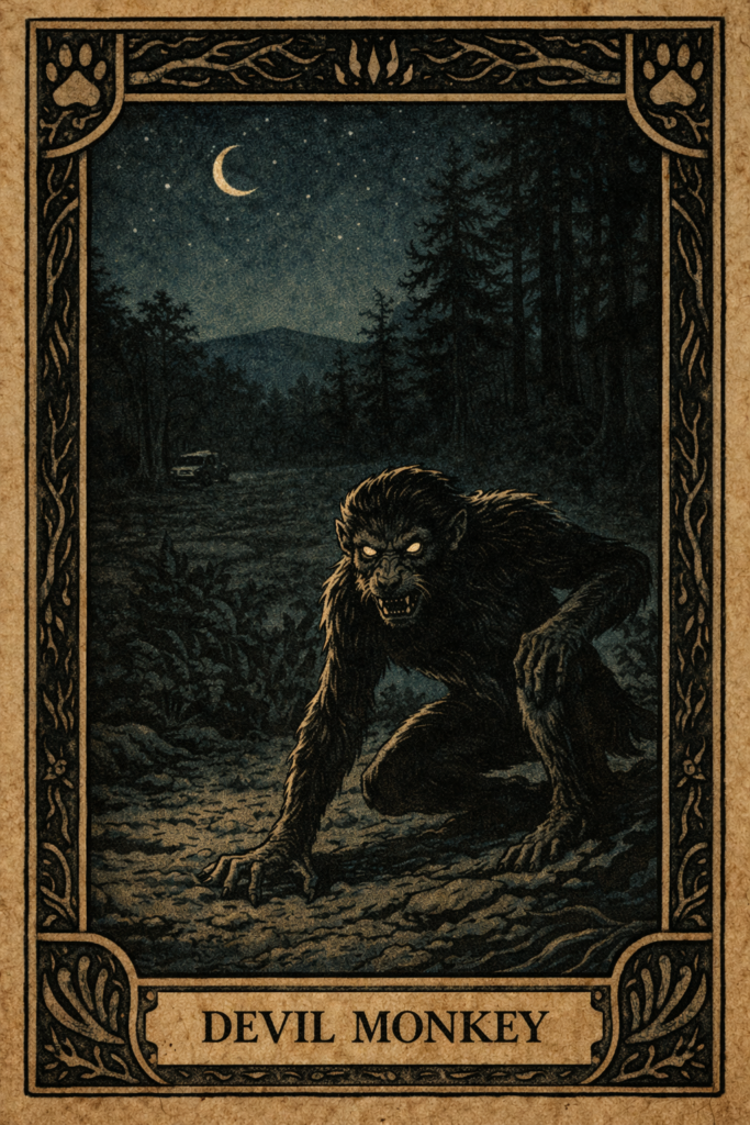 The Devil Monkey operates as a smaller but more feral Bigfoot. It lacks grandeur and trades mystery for hostility. Instead of distant majesty, it brings something quick, mean, and too close to your front door.