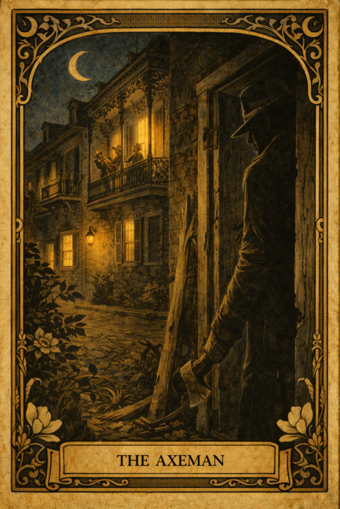 The Axeman stalked New Orleans and nearby Gretna, Louisiana, during 1918 and 1919. Victims were mostly Italian grocers and their families, attacked at night in their homes. Reports said he broke doors with a chisel and used an axe inside. On March 16, 1919, a newspaper printed the famous jazz warning letter.