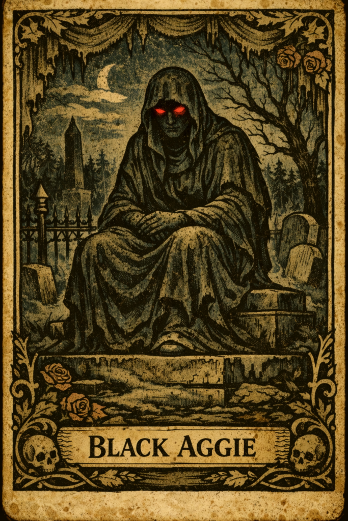 Black Aggie stood on the Agnus family plot in Druid Ridge Cemetery, Pikesville, Maryland. It was a shrouded seated statue, later tied to Baltimore dare stories. The legend grew after the statue reached the grave in the 1920s. Stories said its eyes glowed red at midnight. Other tales warned of blindness, miscarriage, and death in its lap.