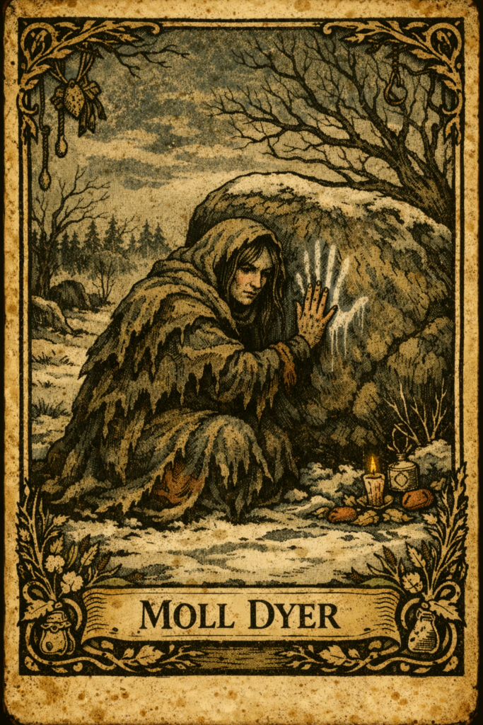 Moll Dyer belongs to Leonardtown witch lore in St. Mary’s County, Maryland. According to legend, villagers blamed her for influenza during the winter of 1697 and 1698. A mob burned her hut south of present-day Leonardtown. Days later, people found her frozen against a large rock.